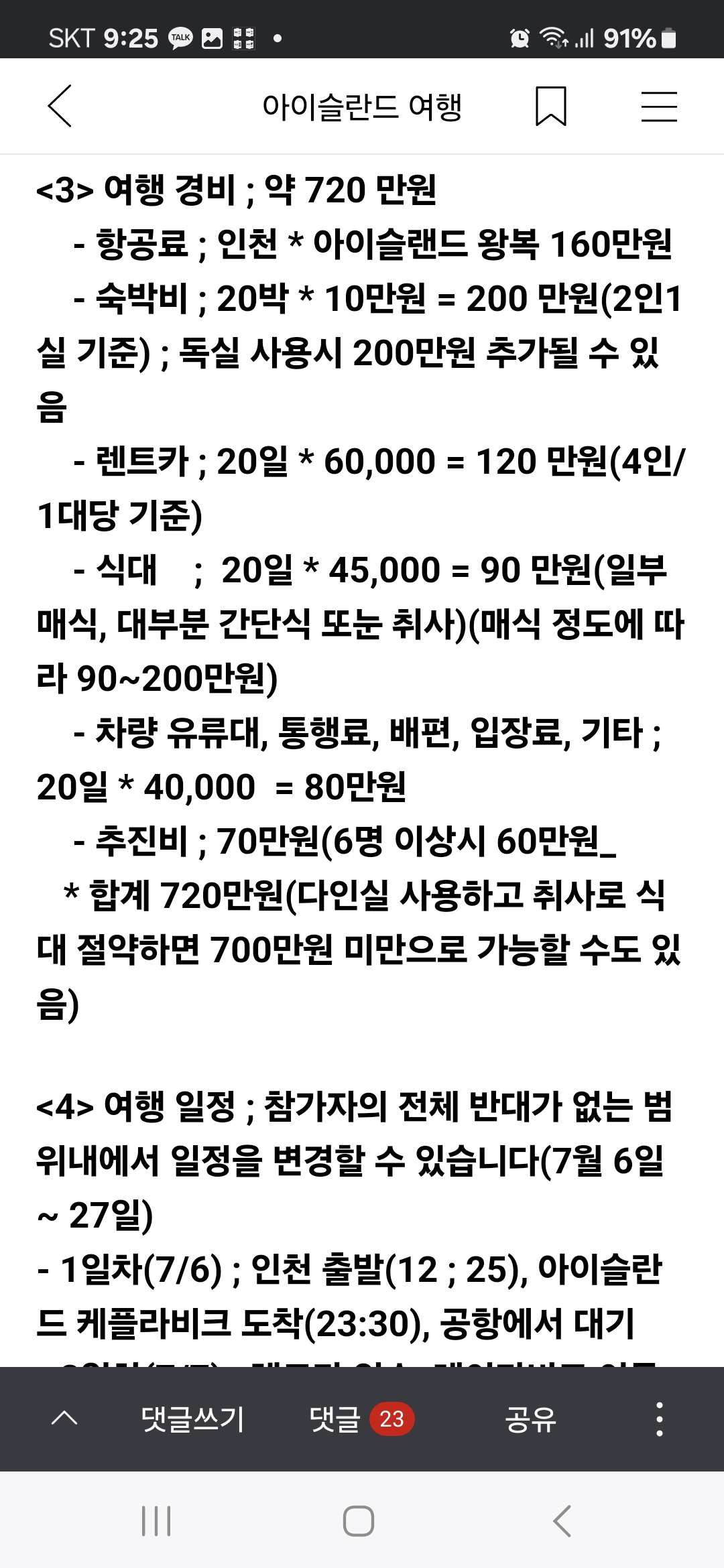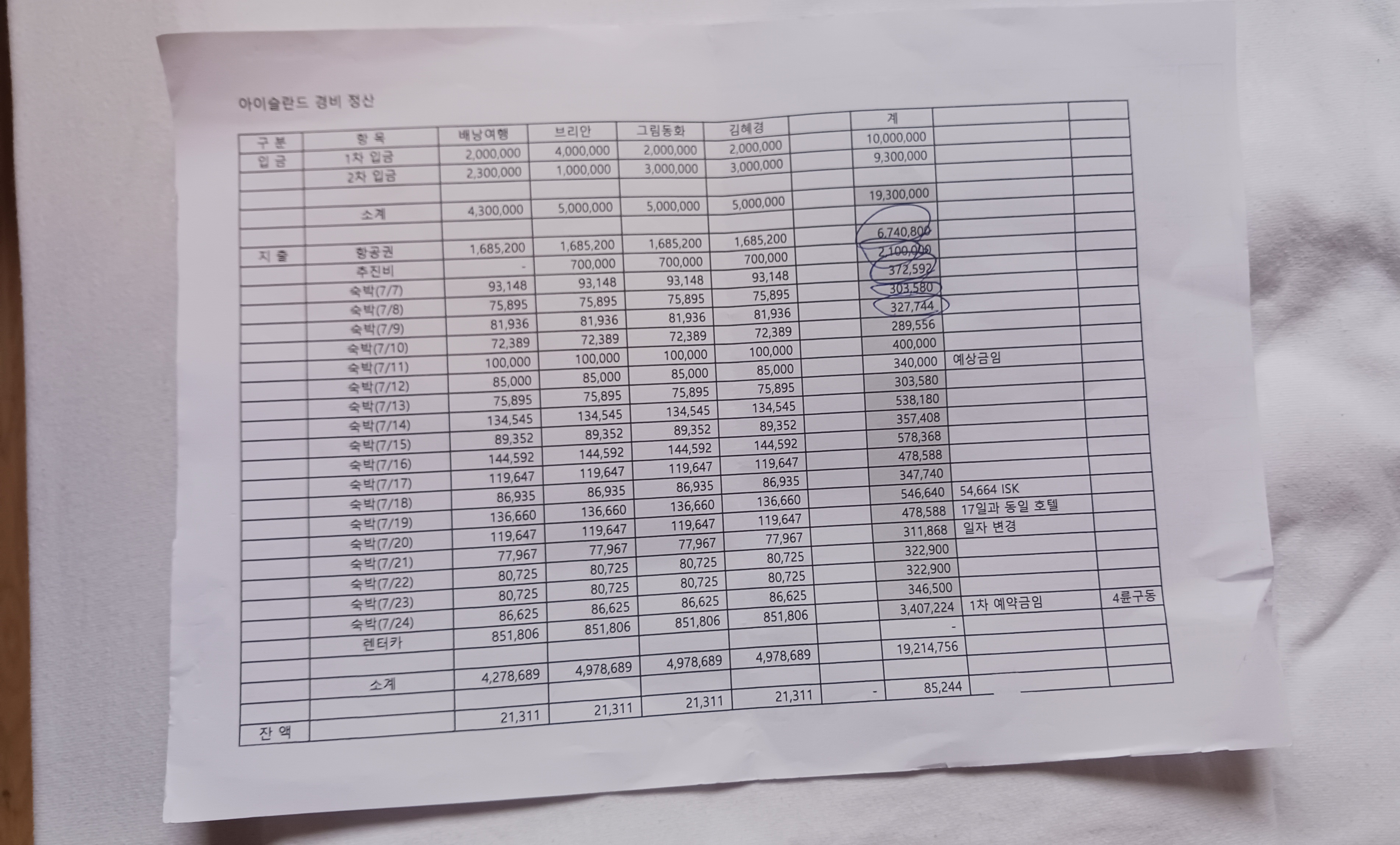 항공권 왕복 1,685,200원 추진비 70만원 숙박비 175만원 렌트카 851,806원+추가요금 일단 1인당 500만원 씩 선지출 후 출발~