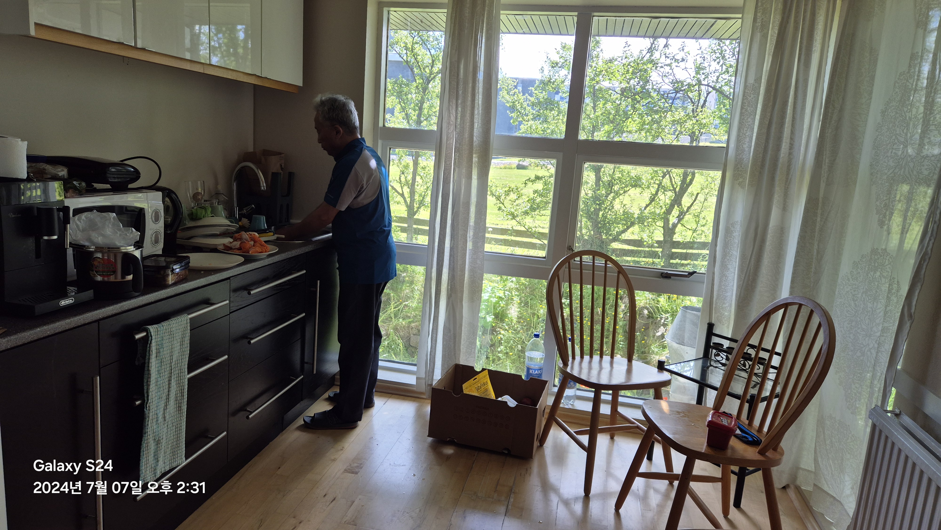 2층 주방에서 방장님이 연어 회 를 준비하고 계신다