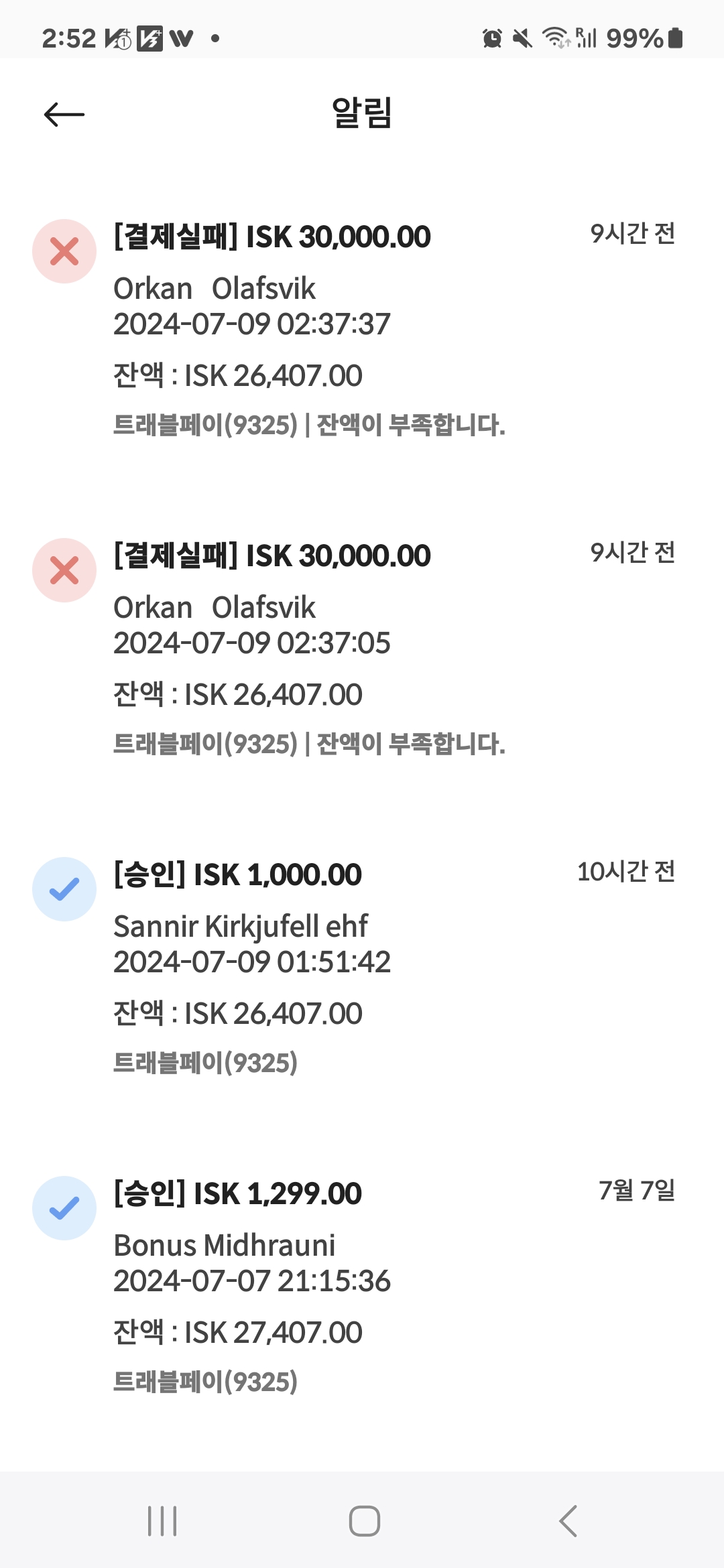 트레블월렛 승인 내역을 확인하니 결제실패 이유가 잔액 부족이라고 나온다 기름넣을 정도는 잔액이 남아 있는데 이상해서 조회를 해보니 기름 넣으려면 잔액 30000크로네 이상 있어야하고 브리안님이 20000크로네 결제된거는 보증금 빠져나간거란다~ 아이슬란드 에서 기름넣는건 복잡하다~ㅠㅠ