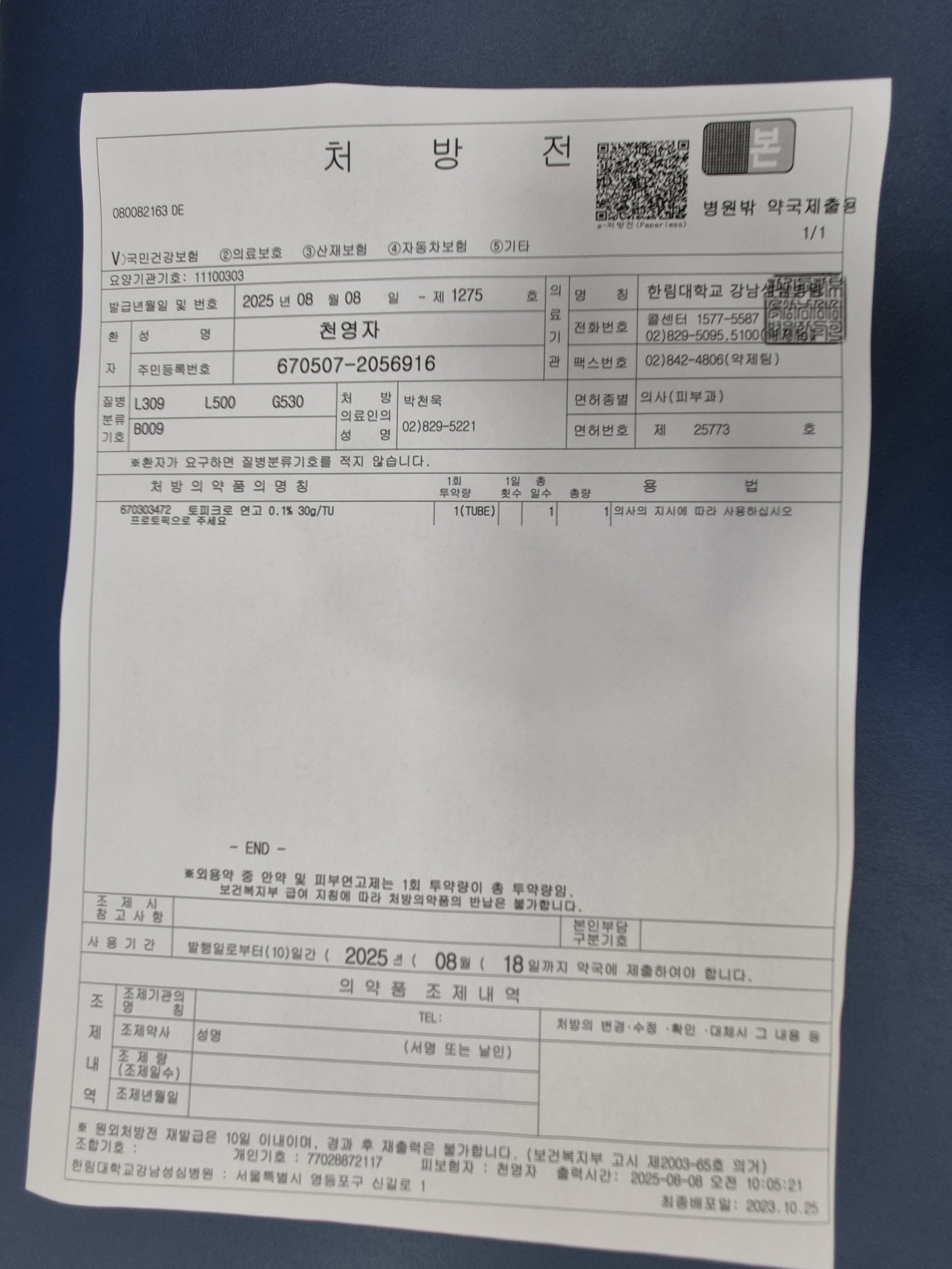 한림대 강남성심병원 피부과 박천욱 교수님께 진찰을 받고 연고 처방을 받았다