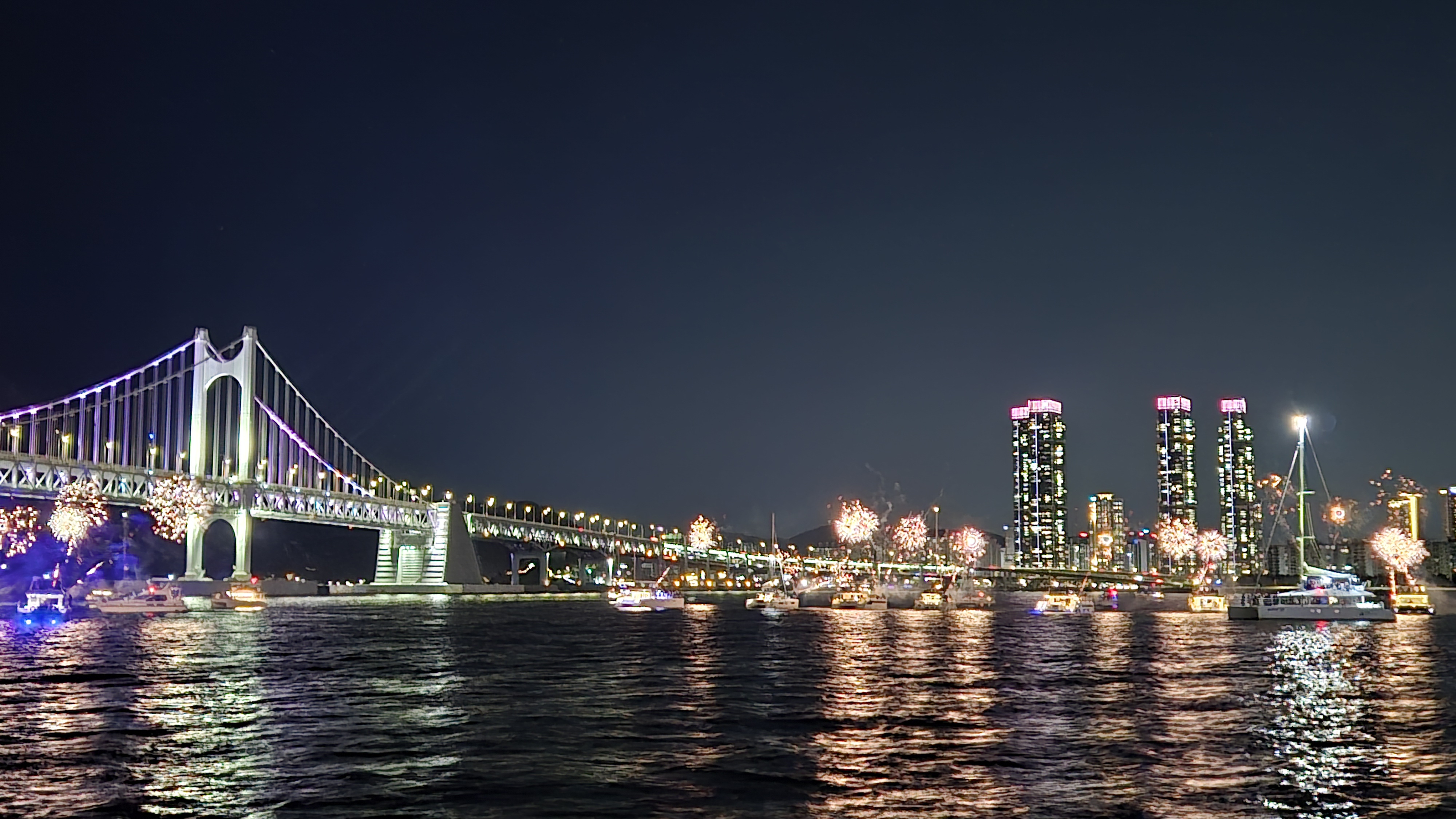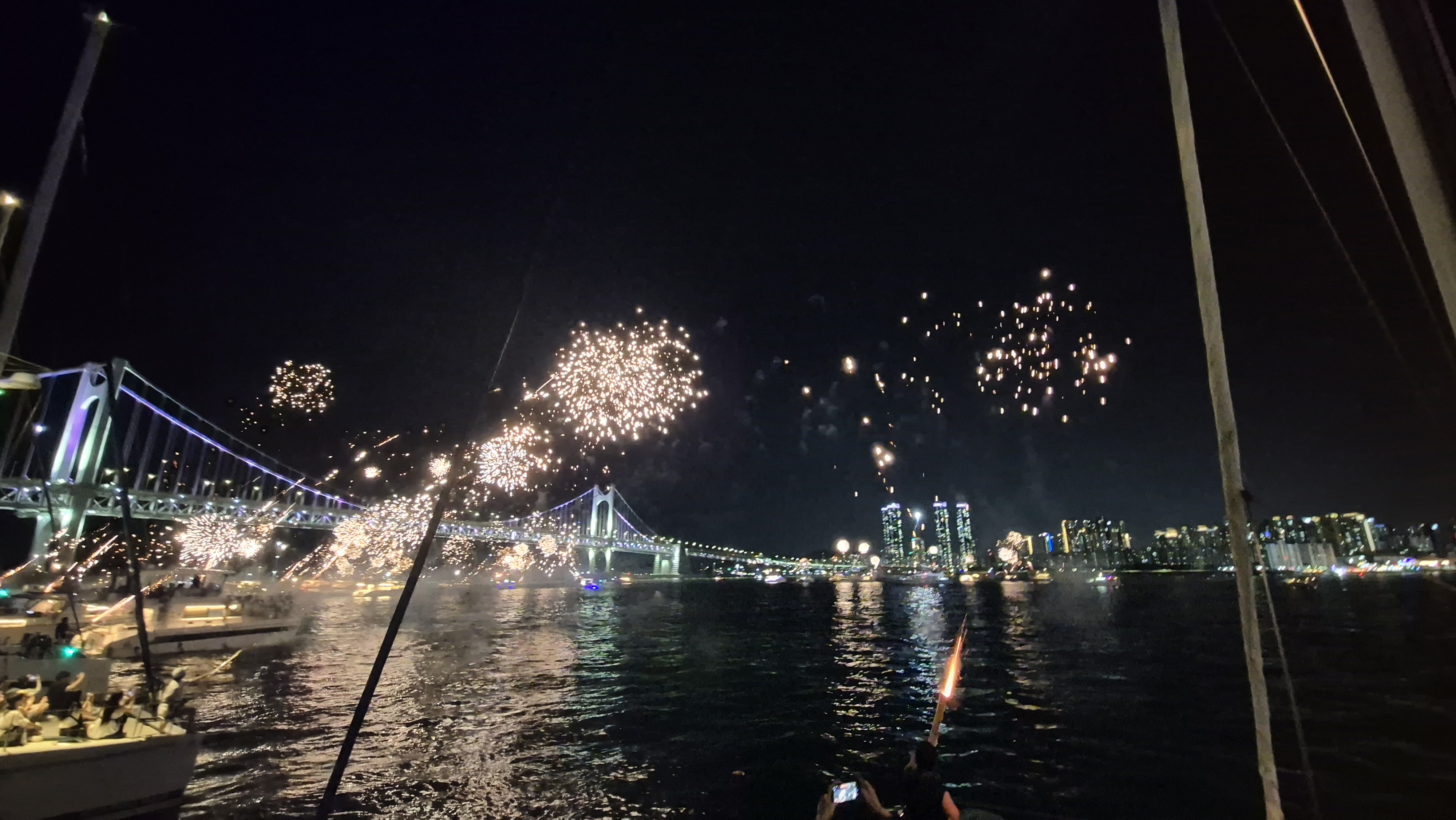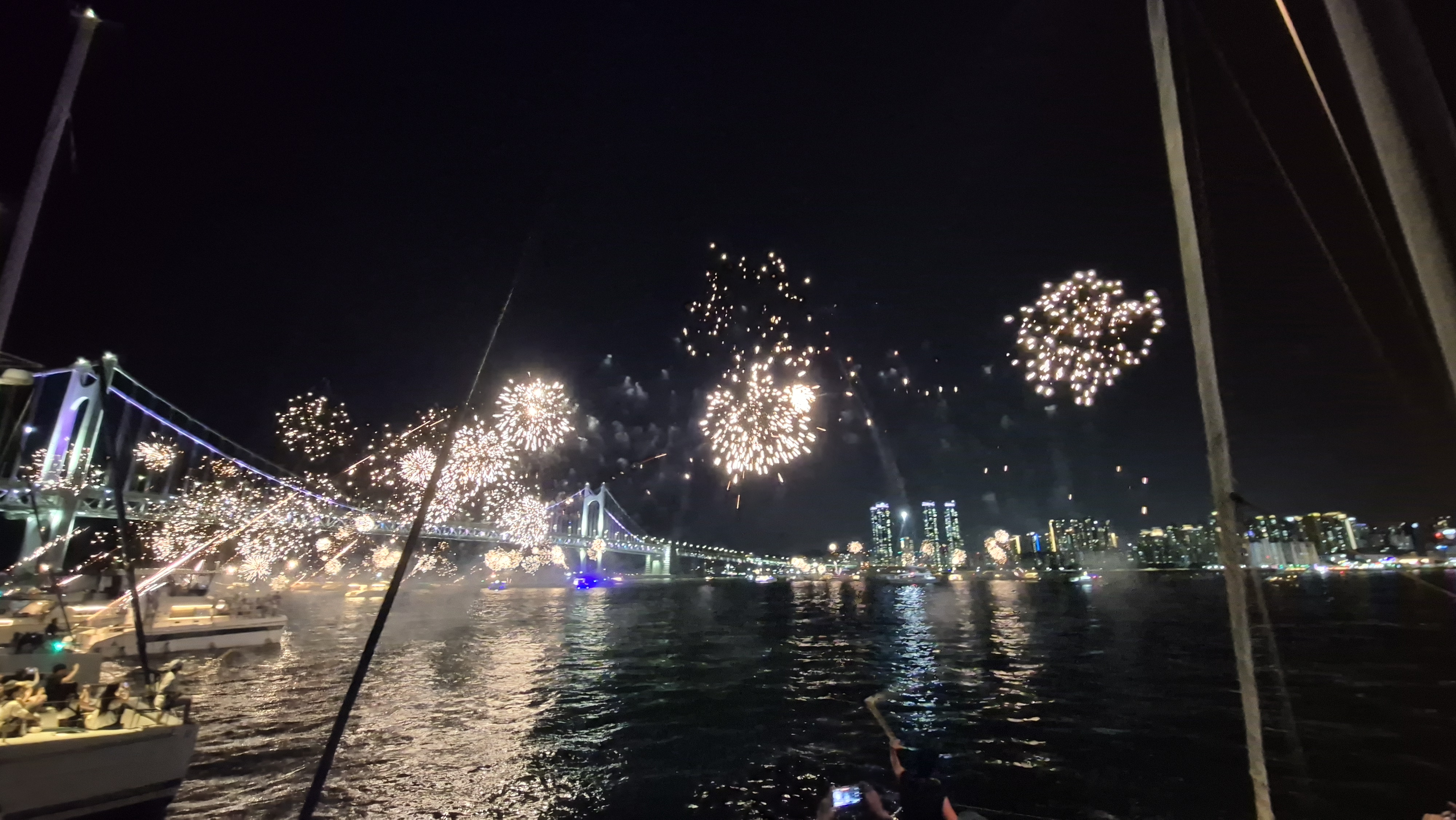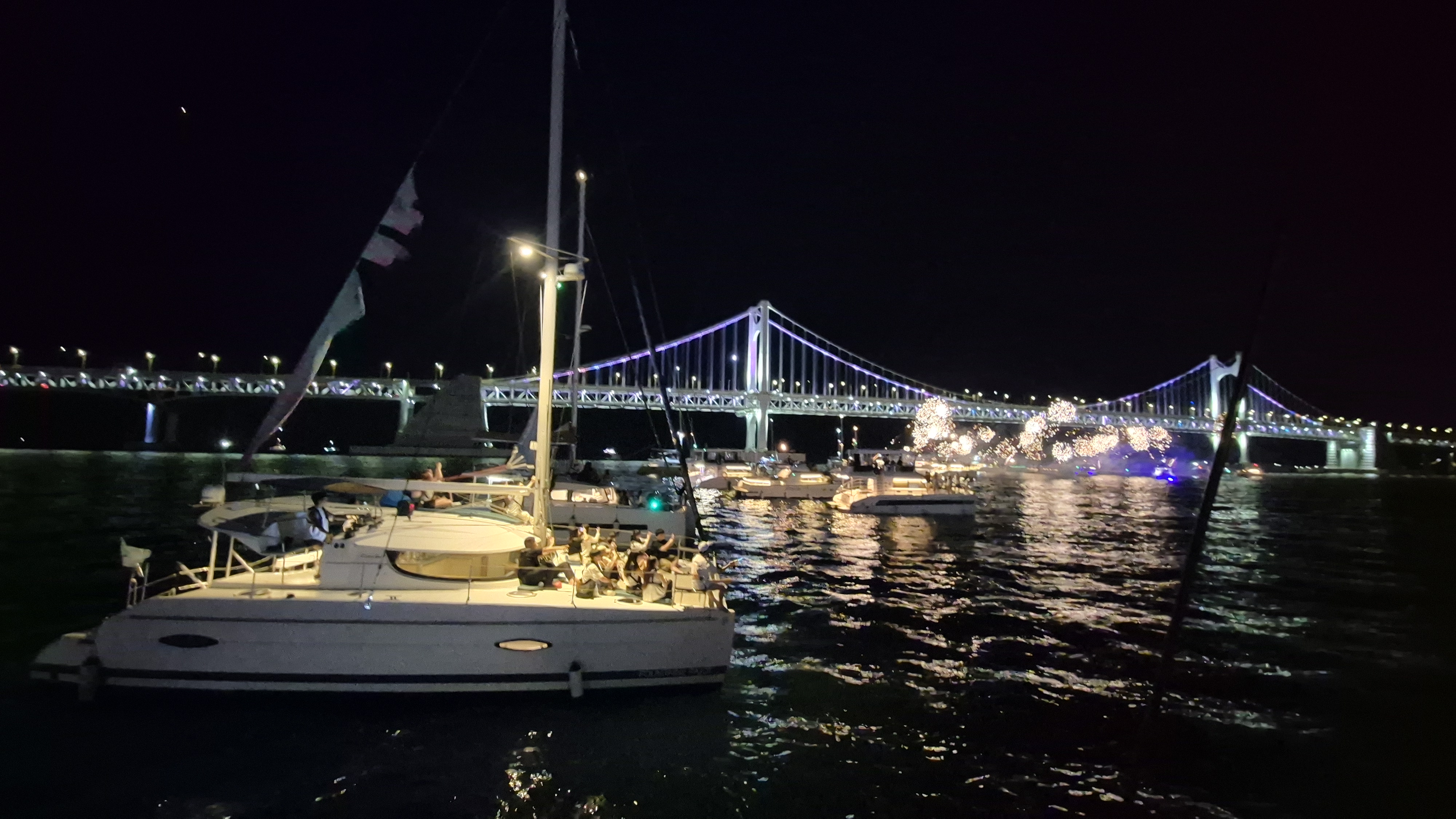 광안대교 아래서 요트들이 일제히 폭죽을 쏘아올린다 장관이다 ㅎ