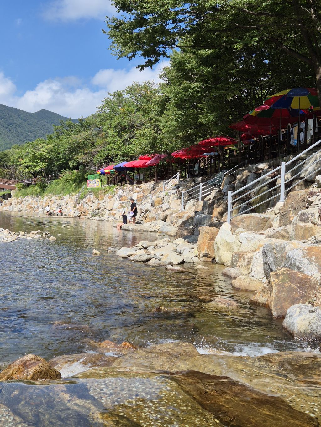 파라솔 아래서 음식 먹으며 물가에 내려가 놀 수 있다
