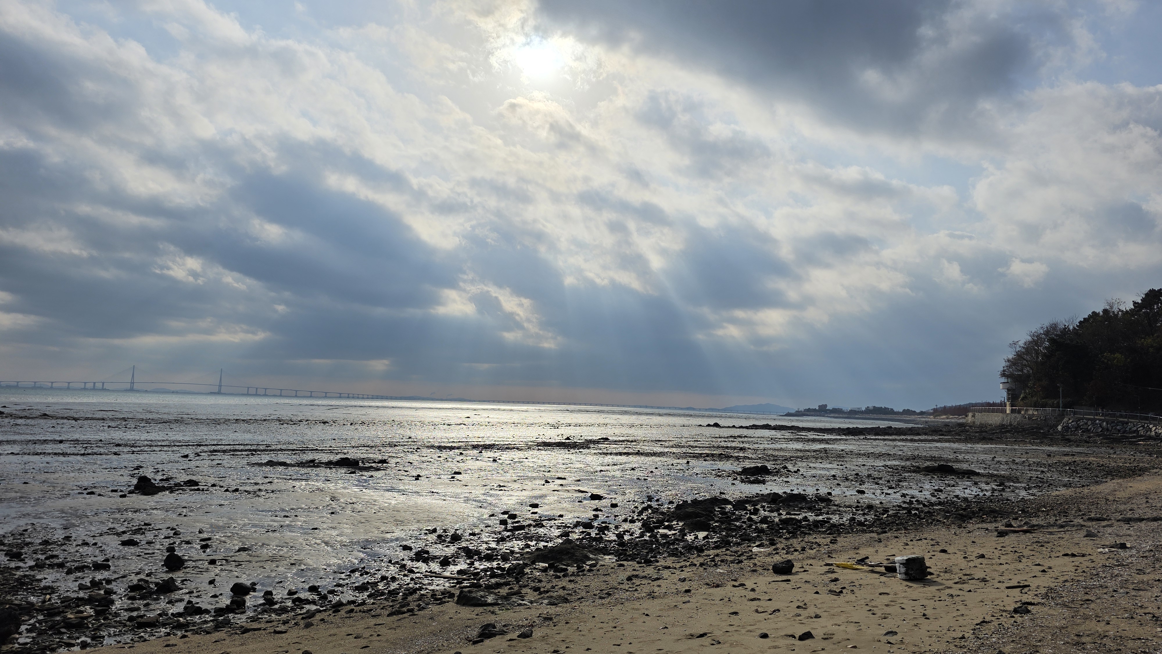 구름 사이로 빛내림이 있고 윤슬 도 빛난다