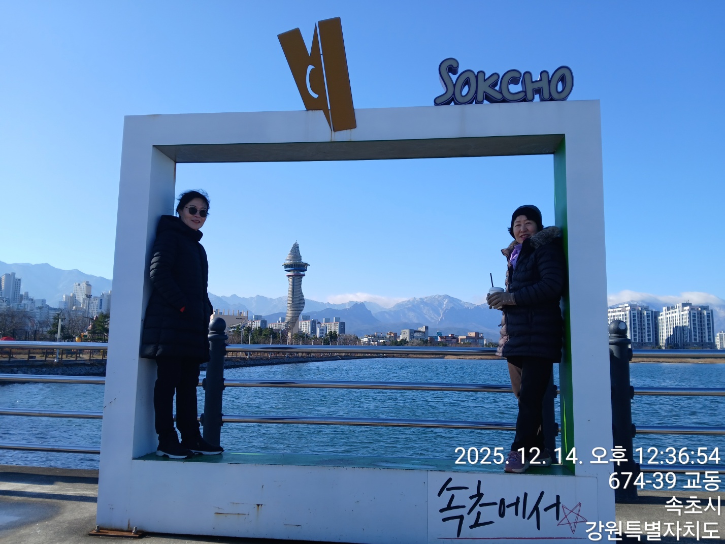 청초호 주차장에 피노디아 엑스포타워 전망대 인증사진
