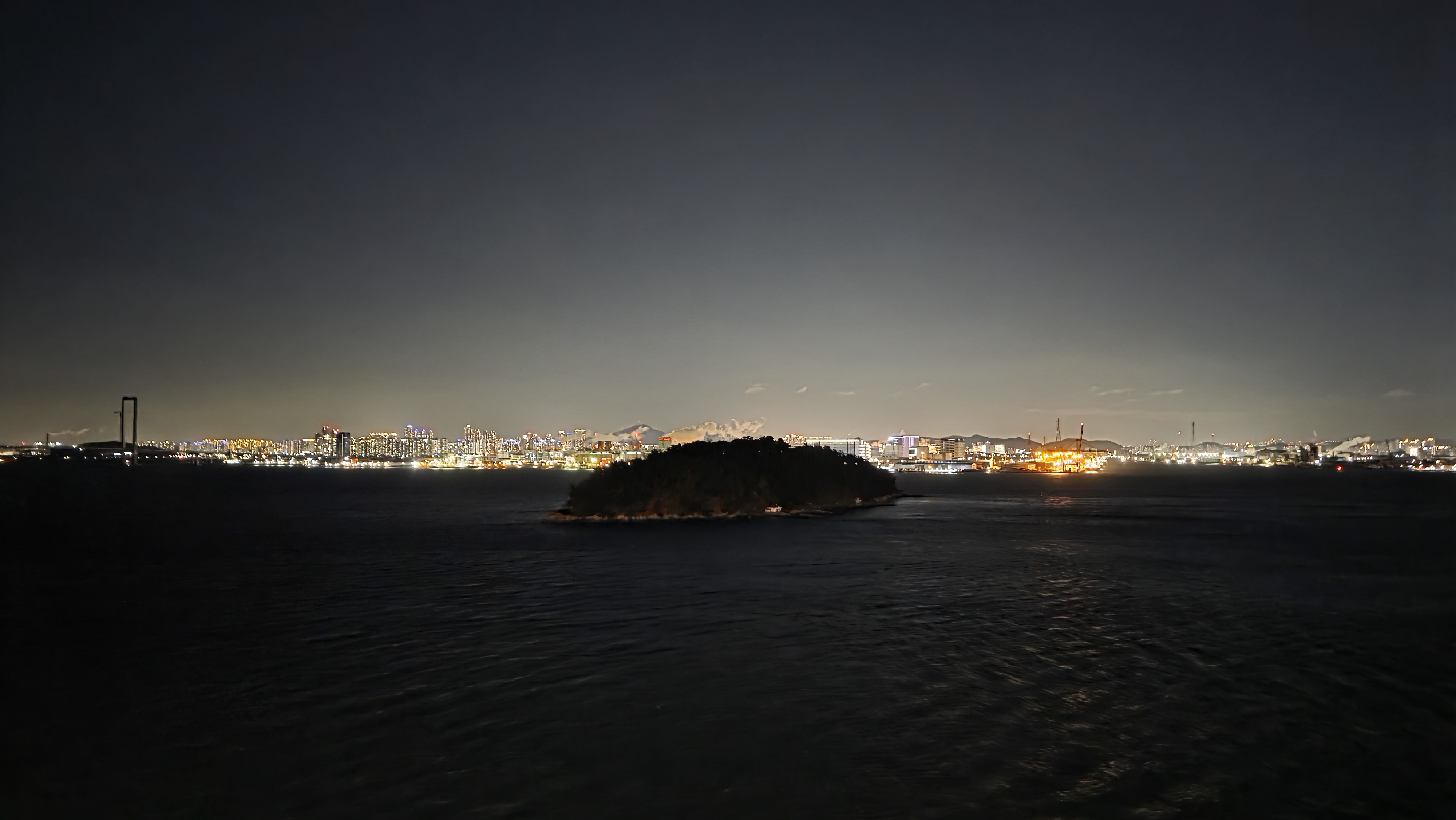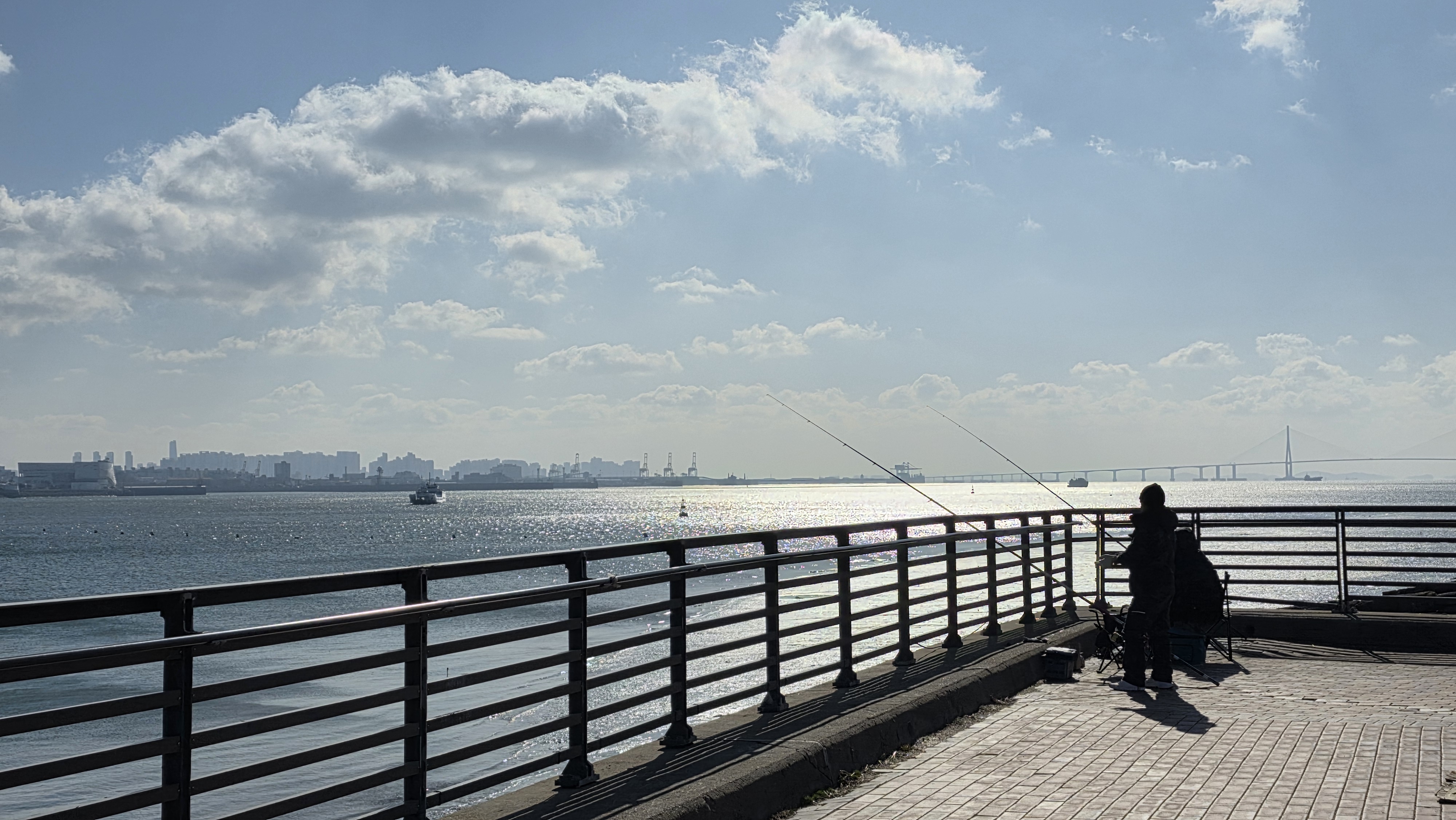 멀리 여객선이 정박해 있고 낚시 하는 분들도 계신다