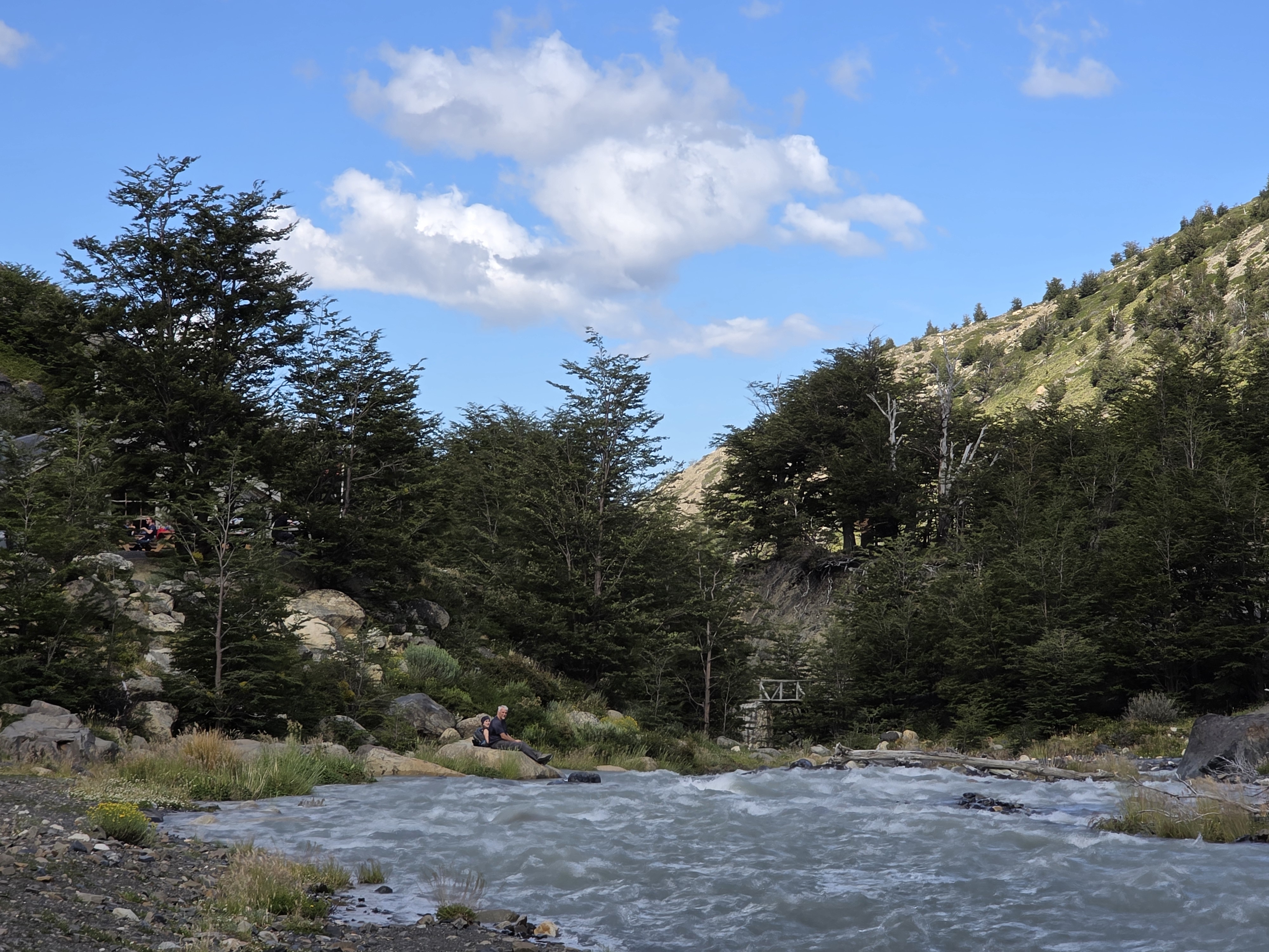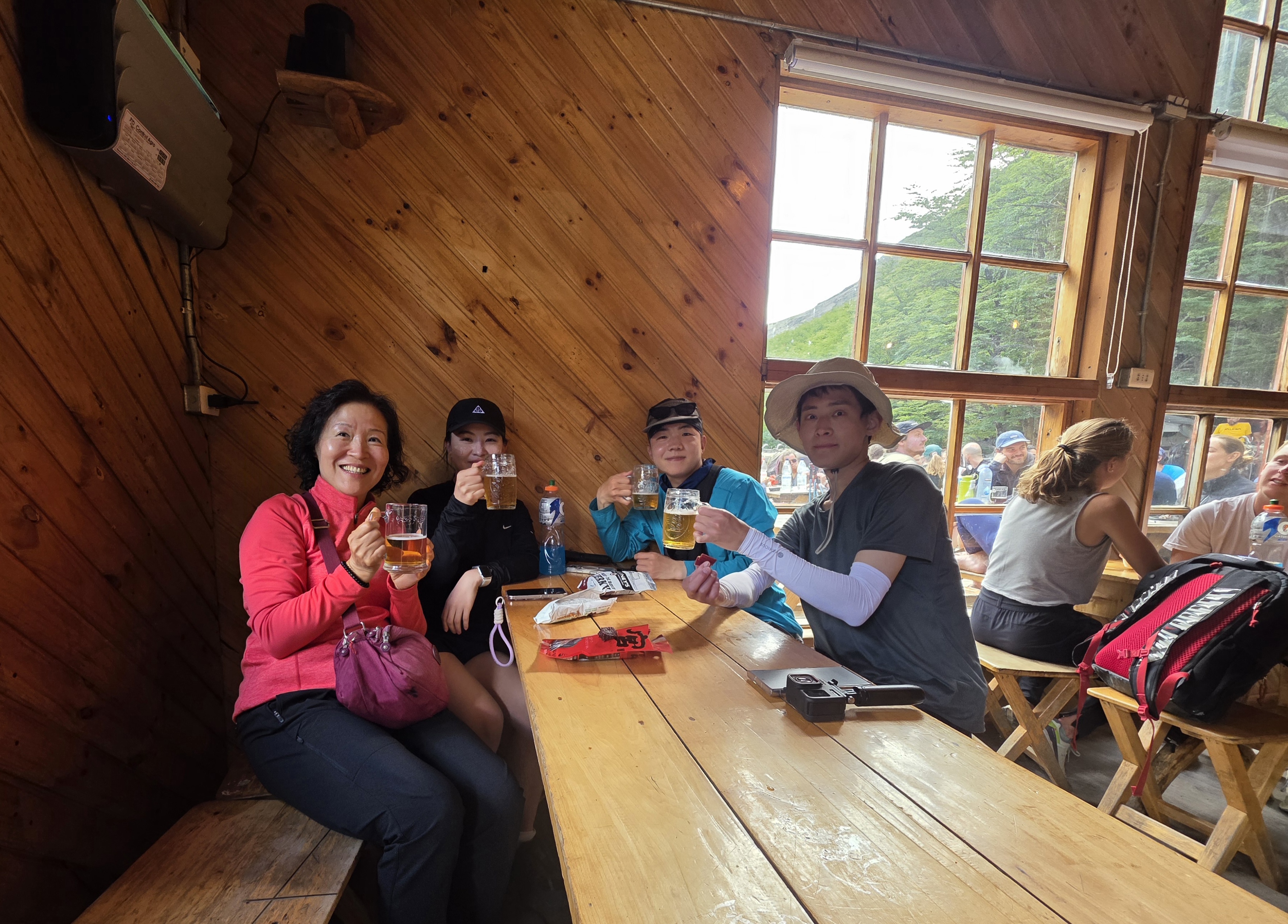 트레킹 후 칠레노 산장 옆 야외 테이블에서 휴식을 취하고 있는 사람들