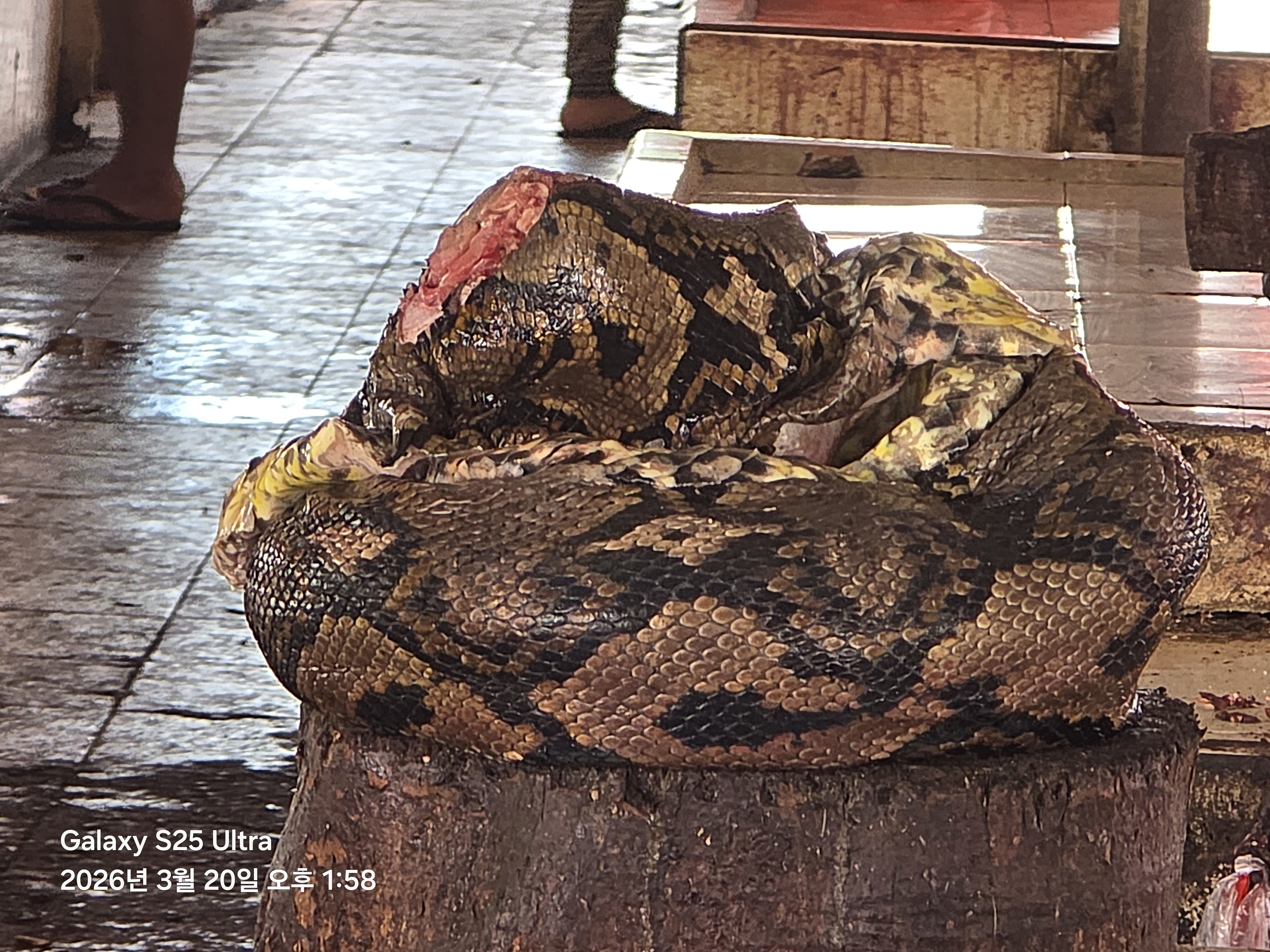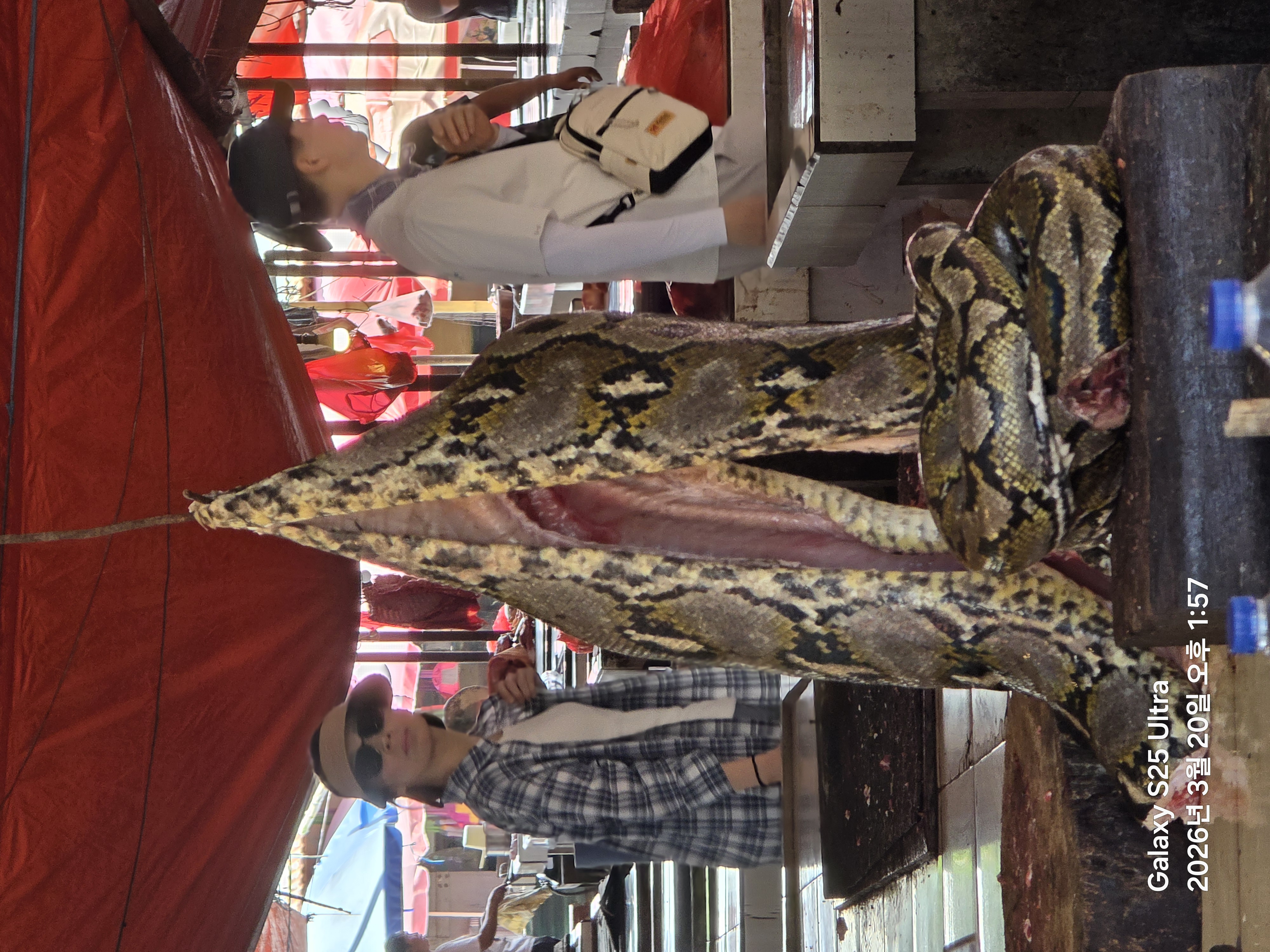 아나콘다 뱀 내장은 다 제거하고 걸어놨는데 머리와 꼬리가 맛있어서 먼저 팔린단다