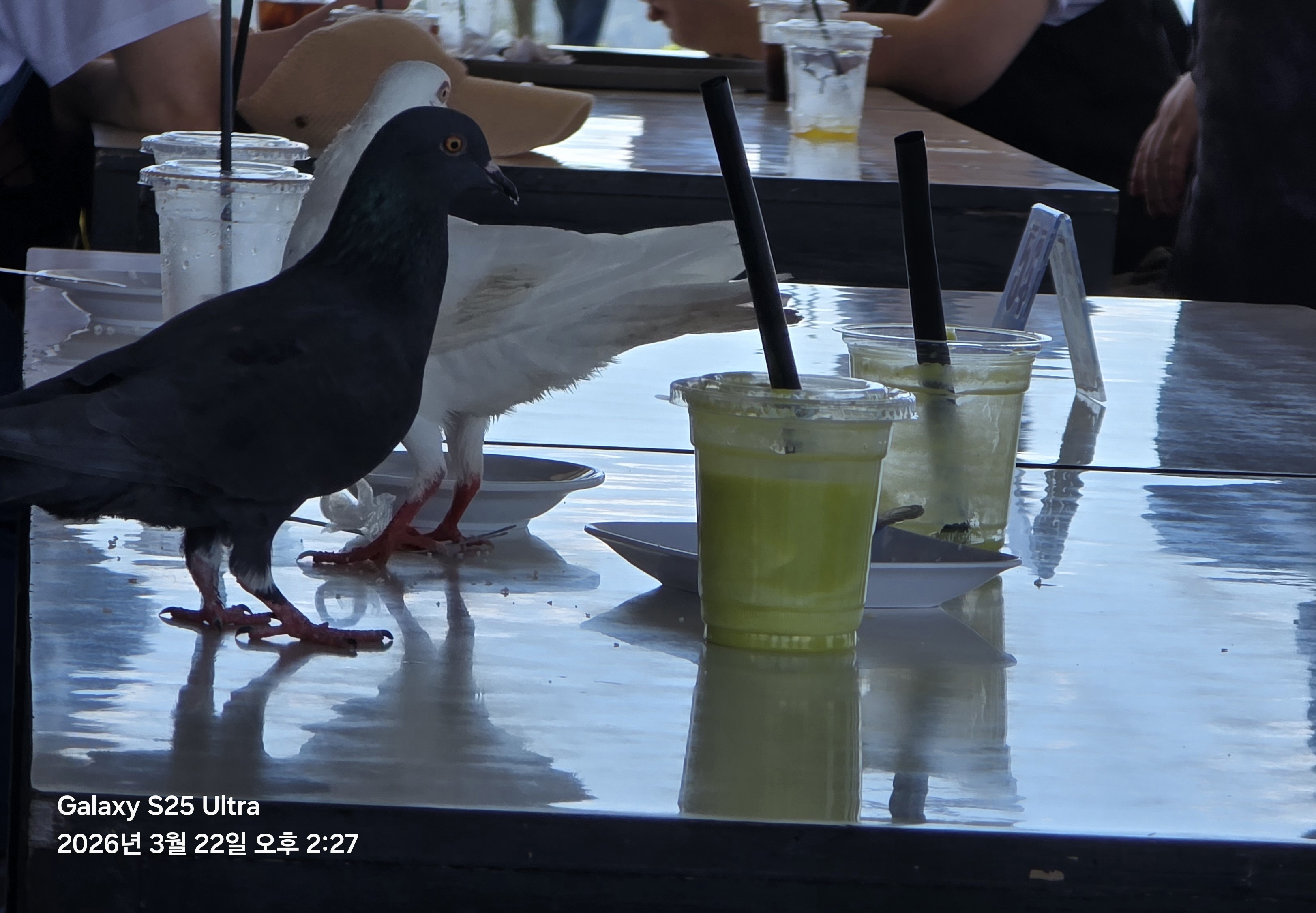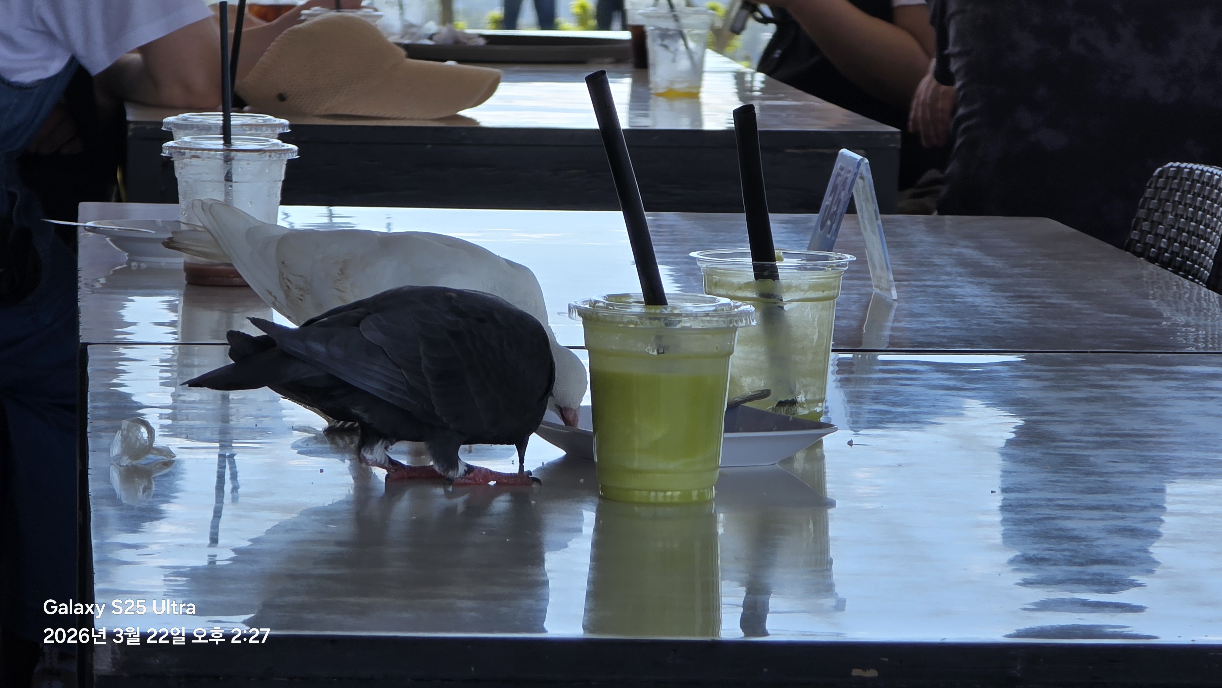 다른 팀 아보카도 쥬스와 간식에 날아든 새들